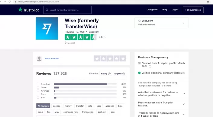 Revisión de TrustPilot Wise (anteriormente TransferWise)