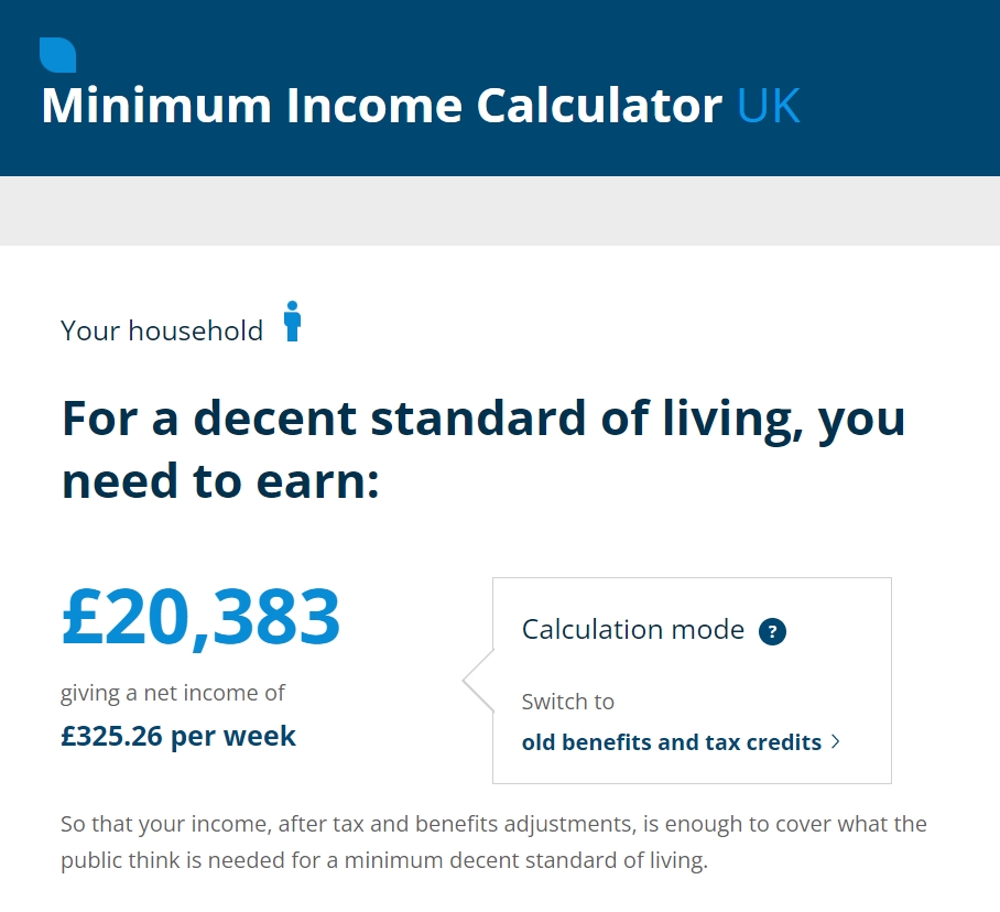 According to the data provided by this tool, a single person needs a minimum of £20,383 per year for a decent living.