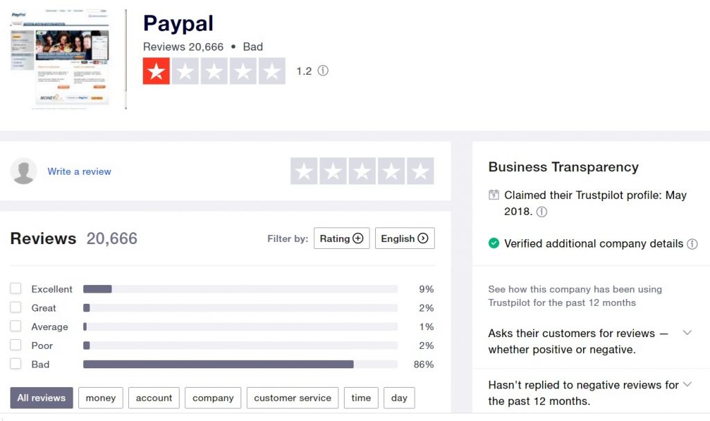 Despite all the positives that PayPal has going for it, what do the reviews for the company say on websites such as TrustPilot? Well, PayPal review is not so good, to say the least. PayPal has a total review score of 1.2/5 stars on TrustPilot, which is labeled as ‘bad’ on its website.