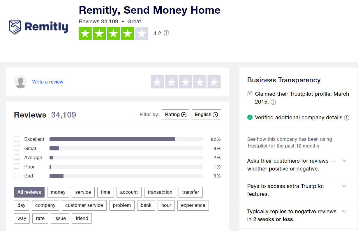 Remitly has a rating of 4.2 over 5 on Trustpilot.