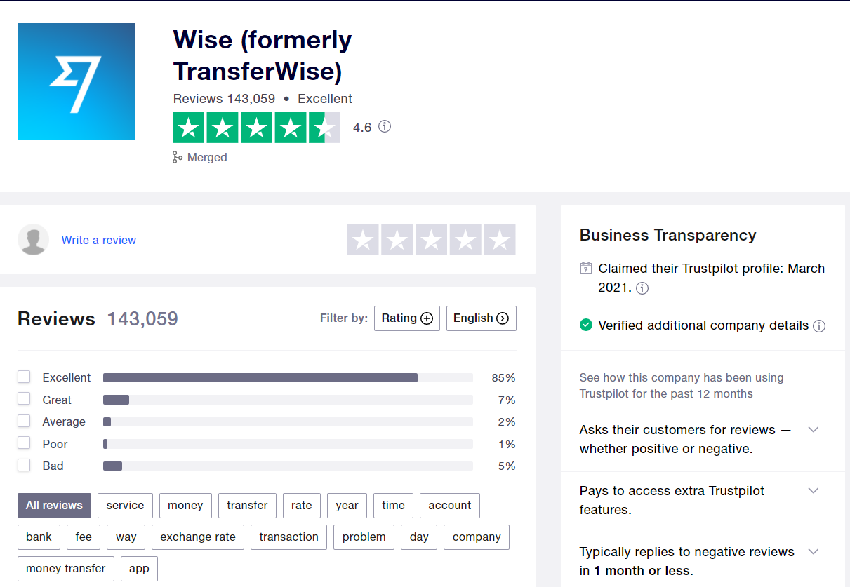 As of January 2022, 143,059 users have left their reviews, and around 82% of them have given 5 stars. The users have stated that Wise has low fees and the transfers are fast.