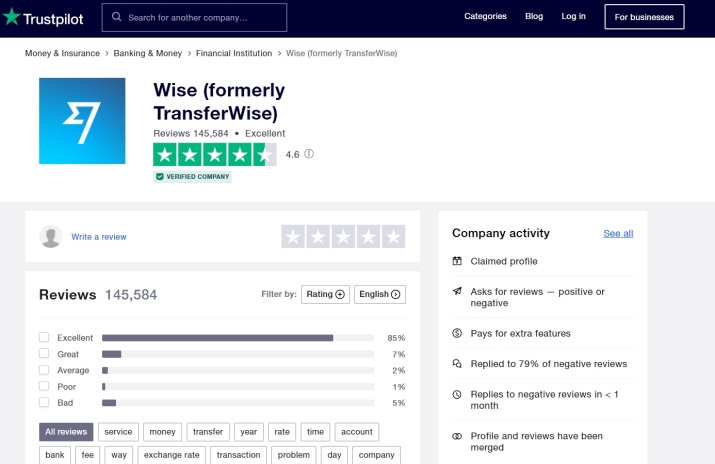 Wise received over 145,000 reviews on Trustpilot and its score is 4.6 over 5. However, there is a small group of users who have rated the service as poor or bad.